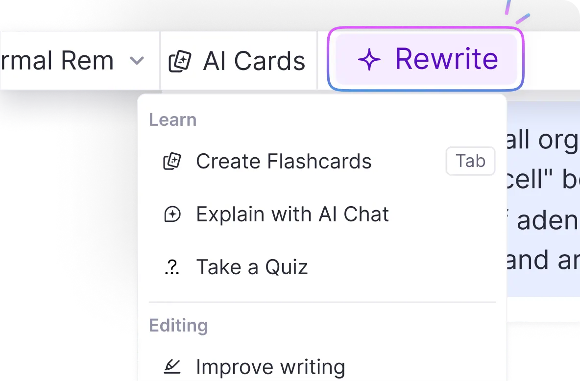 Select text for instant help with clarifications, grammar fixes, edits, or flashcard creation.