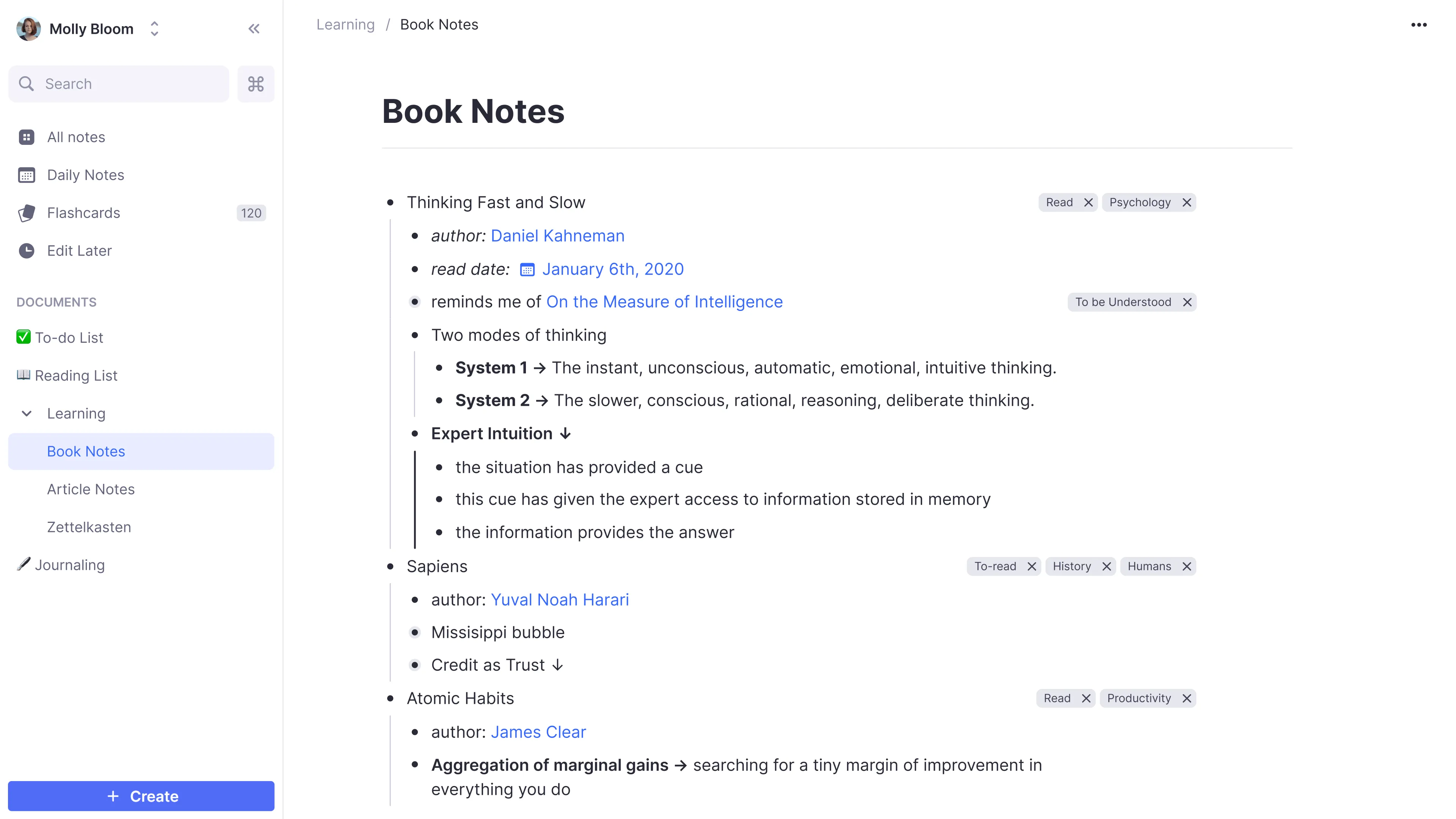 Take notes in our flexible bullet-point editor. Organize, tag, and link notes to build a comprehensive Knowledge Base that keeps all of your study materials in one place.